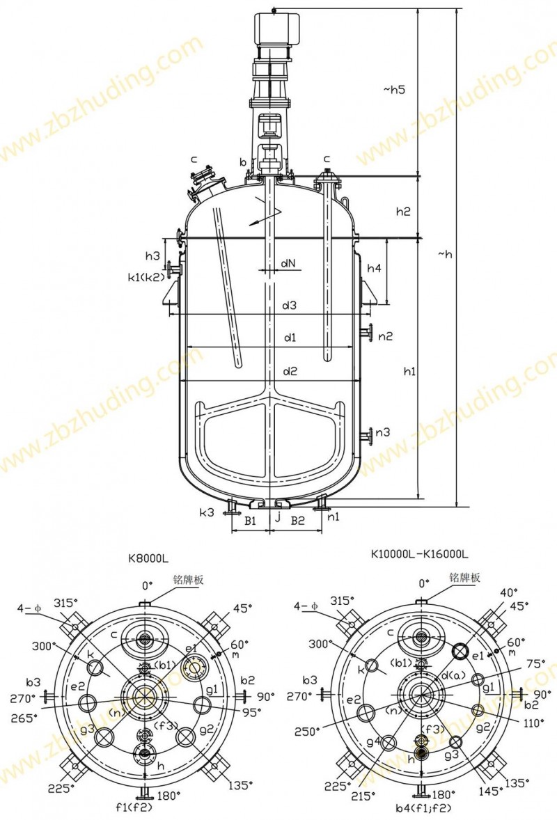 【K型搪玻璃反應器的技術參數】: K1000L-K6300L開式搪玻璃反應釜(開式搪瓷反應釜)設計圖紙及參數如下所示: